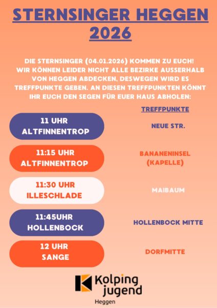 Mit ihrem Besuch und den Segenswünschen knüpfen die Sternsinger an eine lange Tradition an und setzen zugleich ein Zeichen für Gemeinschaft und Nächstenliebe. Die Kolpingjugend Heggen lädt alle herzlich ein, die Sternsinger an den Treffpunkten zu empfangen und den Segen mit nach Hause zu nehmen.