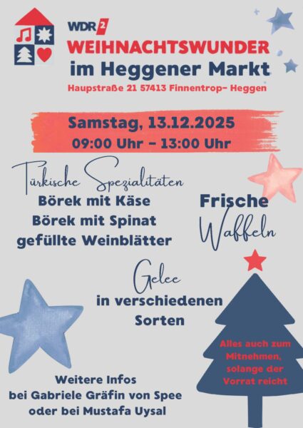 Sollten die leckeren Vorräte allerdings schnell ausverkauft sein, bitten wir um Nachsicht. Dann geht es vor allem auch um die gute Sache: die deutsch-türkische Gemeinschaft, die Gemeinschaft in unserem Dorf Heggen und schließlich um die weltweite Aktionsgemeinschaft „Gegen den Hunger in der Welt.“